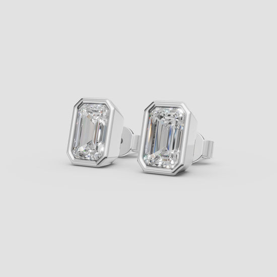 Emerald Cut Diamond Stud Earrings with a bezel setting.