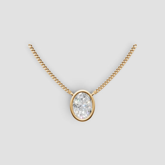 Cut: Oval diamond Setting: Bezel Metal: Available in 9ct or 18ct gold (white, yellow or rose) Diamond sizes: 0.5ct - 5ct