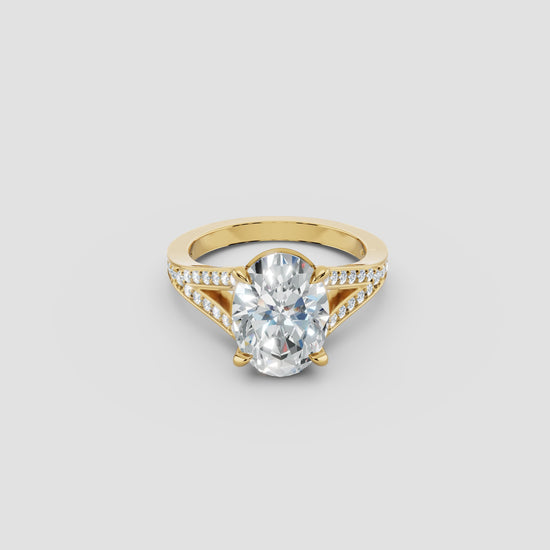 Oval centre stone, cathedral setting with diamond set split shank.